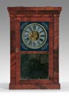 Lot #38 - New England Striking Mirror Clock Case in old patina w/ebonized & gilt 1/2 columns & rosettes. Original painted metal dial. Appears to be original reverse painted tablet & mirror. 8 day t/s, brass weight driven movement. Provenance: Robert Ewald. Ht. 30" Est. $1,000-1,500