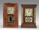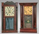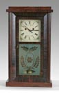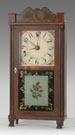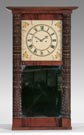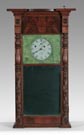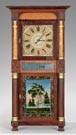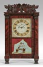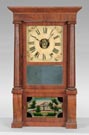 Lot #16 - Jerome, Thompson & Co. Shelf Clock - Mahogany case in original finish w/fluted pilasters & carved capitals. Original reverse painted tablets. 30 hour t/s, groaner wood works weight driven movement. Ht. 37 3/4" Est. $1,000-1,500