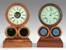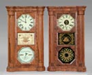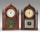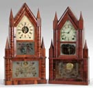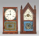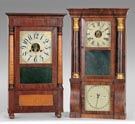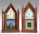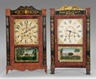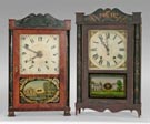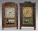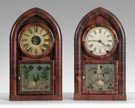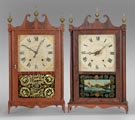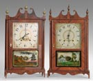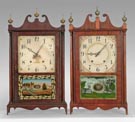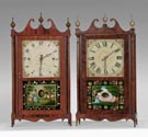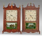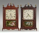 Lot #30 - (L) Birge & Fuller Steeple on Steeple Mahogany case in original finish. Original painted metal dial and Fenn glass tablets. 8 day t/s, brass Ives patent wagon spring movement. A choice example. Provenance: Robert Ewald. Ht. 27 1/2" Est. $2-3,000