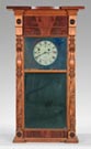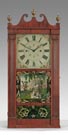 Lot #39 - (L) Rare Chauncey Ives Pillar & Scroll Mahogany case in nice old patina. Original painted wood dial. Unusual reverse painted tablet depicting dogs & floral decoration. Original finials. 30 hour t/s, wood works weight driven movement. Good clean label. Ht. 31" Est. $2-3,000