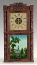 Lot #64 - (L) Eli Terry & Sons Pillar & Scroll Mahogany case in old patina. Original painted wood dial, reverse painted tablet. 30 hour t/s, weight driven wood works movement. Good label. Ht. 31" Est. $700-1,000