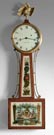 Lot #55 - Early New England Banjo Clock - Mahogany case with half round front moldings. Original signed "Warranted" & painted early iron dial. Original reverse painted glasses, some old cracks to both glasses. Replaced hands, eagle finial and tin cover behind the pendulum. 8 day timepiece movement. Ht. 32 1/2" Est. $800-1,200
