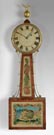 Lot #59 - Early Patent Banjo Clock - Mahogany case with half round frames in an old finish and with minor case chips. The case and frames are stamped “650”. The zinc dial has had the numerals redone. Original reverse painted glasses, “Patent” lower glass. 8 day timepiece, single bridge brass movement, . Similar examples made by Samuel Eaton of Boston. Ht. 34" Est. $1,500-2,500