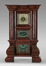 Lot #29 - Rare J.C. Brown Super Empire Shelf Clock Highly figured mahogany case w/deep rich, probably original finish. Painted wood dial. Bottom door opens to clean original label w/etched tablet. Center door tablet has flying eagle w/banner that reads:Premium Clocks, Bristol, Conn., USA. Under reverse painted eagle is etched J.C. Brown & Co. Movement stamped Forestville Mfg. Co., Bristol, Conn. 8 day t/s, brass weight driven movement. A very fine example. Ex. Peter Zaharis collection. Ht. 40" Est. $8,000-12,000