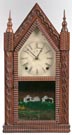 Lot #15 - Eli Terry Jr. Carved Shelf Clock - Carved mahogany case w/fruit basket & leaf crest & 1/2 columns in rich old patina. Original painted wood dial & reverse painted tablet (possible Philadelphia scene), w/minor loss. 8 day t/s, brass weight driven movement. Good, clean label. Outstanding example. Provenance: Robert Ewald. Ht. 36 1/2" Est. $2-3,000