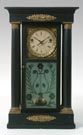Lot #19 - (L) Terry & Andrews 4 Column Steeple Shelf Clock Mahogany case in rich old patina. Original painted metal dial, original Excelsior reverse painted tablet. 8 day t/s, brass spring driven movement, marked Terry & Andrews. Minor veneer repairs to case. Good label. Property from Strong National Museum of Play, sold to benefit the Collections Fund. Ht. 19" Est. $700-1,000