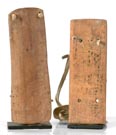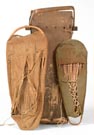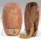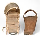 Lot #124, 124A - Two Cradles - (L) Chippewa Birch Bark Cradle, possibly Athepaskin. Leaf décor. Ht. 22 1/2" W 13 1/2" & (R) Salish Hanging Cradle, possibly Klikitat. Green & yellow woven cloth strap. Similar Salish Cradle in Skinner Sale 2237, May 22, 2004, p. 121. Ht. 23" W 9 3/4" Est. $4-600 each. |