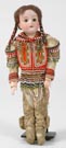 Lot #163 - Athepaskin Doll - End of 19th cent. Beaded jacket. Porcelain doll sgn. on back of neck "Maidein Company 390, A1M." Pictured in "Antique Native American Dolls" by Molloy-Blitz Tribal. Very good. Ht. 17" Est. $2-3,000 |