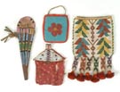 Lot #144 - Miniature Beadwork - Top: Plateau Miniature Pouch w/red satin trim, beaded flower detail & leather strap. Ht. 3 1/4" W 3" Bottom: Sioux Miniature Papose Cover w/deteriation to fabric.Ht. 5 W 3 3/4" Est. $3-500