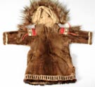 Lot #247 - Eskimo Childs Parka - Hide. Fur/cloth details on arms & hood. Some cracks/splits to hide. L 21" Est. $2-300 |