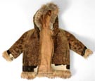 Lot #246 - Eskimo Childs Parka - Hide. Fur trim on hood, wrists & bottom. 2 pockets. L 16" Est. $2-300 |