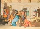 Lot #183 - Sgn. E.S. (1907-1975, NY) W/C - "False Face Healing Ceremony" by Ernest Smith. ©1950. Figure 30 featured in "Face to Face, Encounters with Identity." Published by Rochester Museum & Science Center, 1983. Nail holes in board. 20" x 15" Est. $1,000-1,500 |