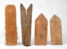 Lot #261 - Group of Cradle Boards 19th Cent. L to R: three Pueblo boards, Navajo double boards. Pictured in "The Art of America's Southwest Indians: by Gary Allen Hood p. 103. L to R Ht. 23", 24", 29", 32" $4-600