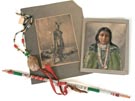 Lot #263 - Group of Native American Artifacts & Photos - Necklace w/shell, L 13 1/2"; Beaded Stick L 22"; Photo of "John Comes Again, Sioux" Photo 271, c. 1899 by Heyn Photo, Omaha; Photo of "Pattie Tom, Apache" #1409, c. 1899 Rinehart Omaha. $1-200 |