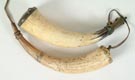 Lot #58 - Two Powder Horns - One engraved w/B.K., deer & fish. "Stand your ground my men for thee we defend w/powder & ball liberty all." Each L 13" Est. $3-500