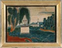 Oval Fingered Storage Box - Paint decorated w/village scene, floral on lid. Small break to lid, some regluing. Ht. 5" W 9" D 7"
