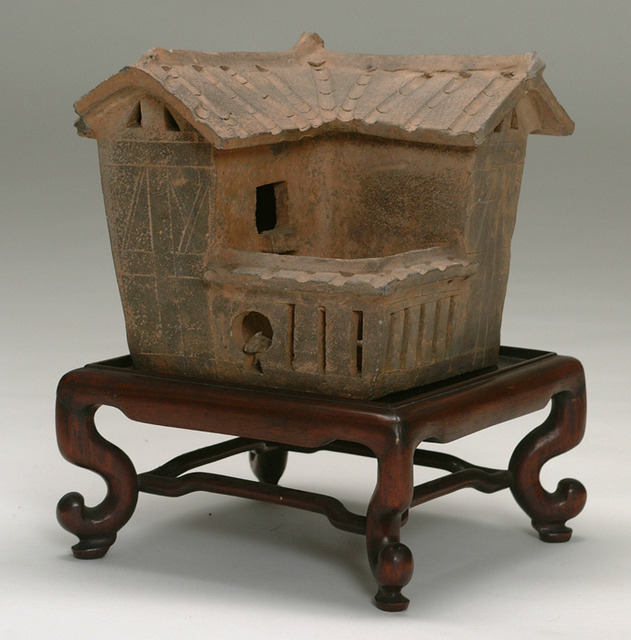 EARLY ASIAN TERRACOTTA CHICKEN COOP, Hsia Dynasty, c 2000 BC, human & animal figures. Square stand. Some losses. Height: 7 1/2", Width: 9 1/4", Length: 9 3/4", Est. $700-1,000 |