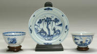 blue and white, 3 rondel scenes, footed; Diameter: 3 1/3";
