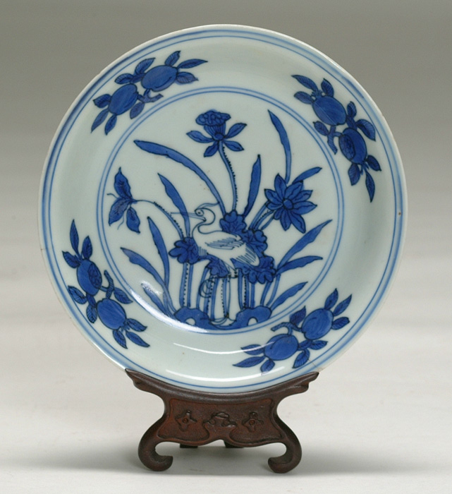BLUE AND WHITE DISH WITH HERON AND LOTUS