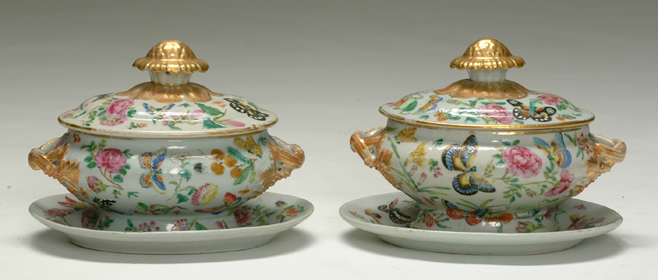SMALL CANTON FAMILLE-ROSE OVAL TUREENS, COVERS AND STANDS,