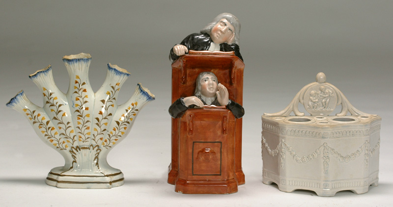 LOT 349. STAFFORDSHIRE GROUP OF THE " VICAR AND MOSES�, Early 19th Century, Back of parson�s pulpit broken, Height: 9