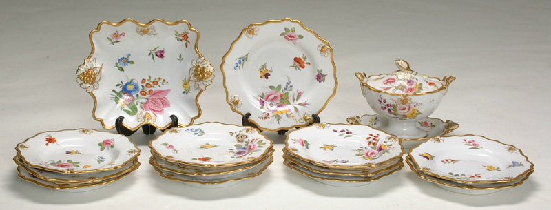 PORCELAIN SAUCE TUREEN WITH COVER AND ATTACHED STAND AND 12