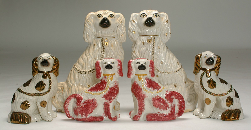 STAFFORDSHIRE IVORY-GLAZED GOLD-SPOTTED FIGURES OF SEATED SPANIELS,