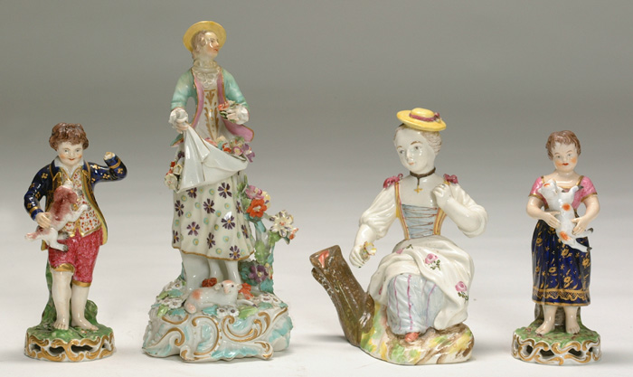 seated lamb and applied flowers. Head restored, chips to flower tips.