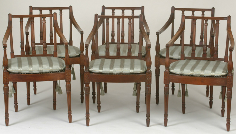 Lot 180. Set/6 Federal Carved Mahogany Armchairs 33" ht, 20" w, 17" seat ht.