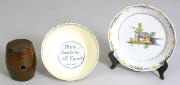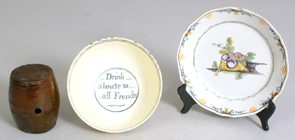 Lot 404-406. Redware Rum Keg; Creamware Bowl "Drink To All Friends";