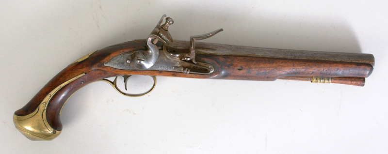 20. British Queen Anne Pistol, silver mounted, 7" London barrel,